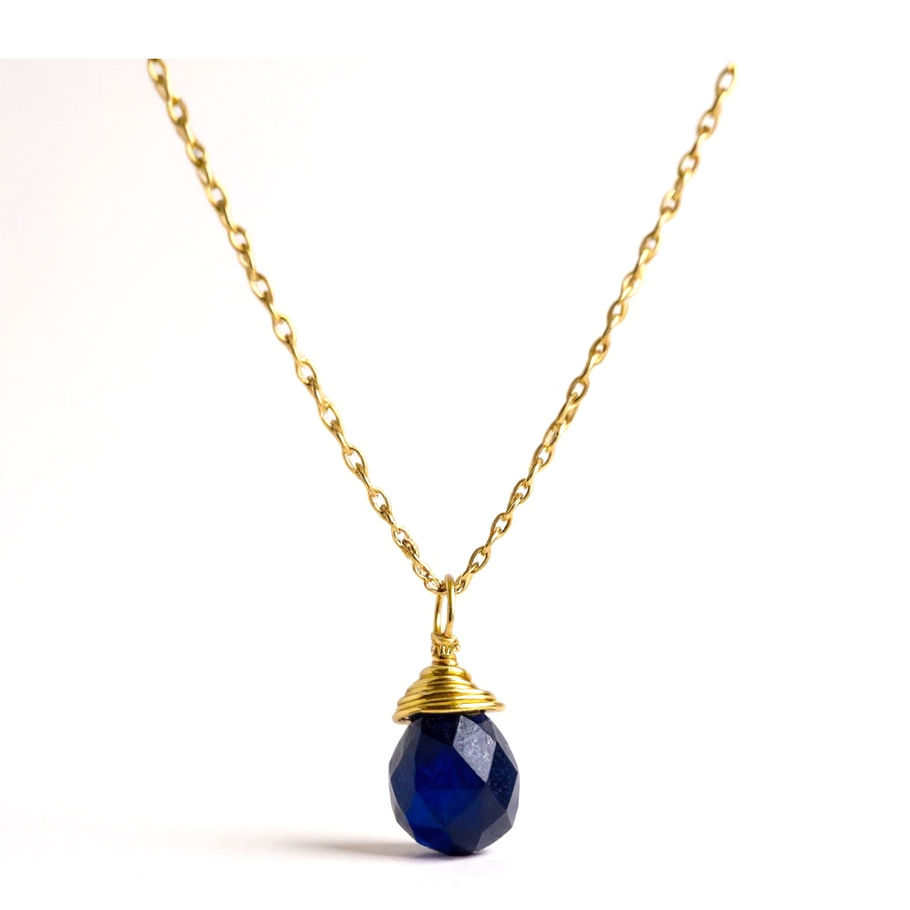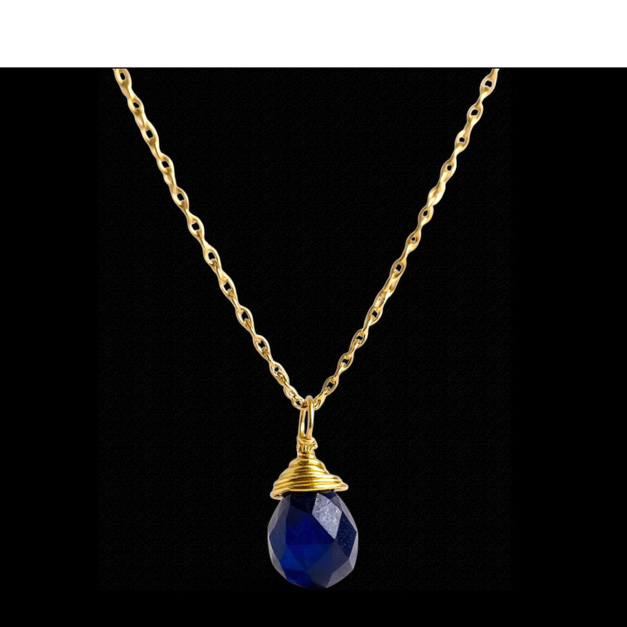 This necklace features a genuine sapphire gemstone in a teardrop briolette cut, hand-wrapped with 14k solid gold wire. The briolette cut maximizes its sparkle with faceting all around. The hand-wrapping creates an artisanal look, and the 14k solid gold construction makes it durable for everyday wear.