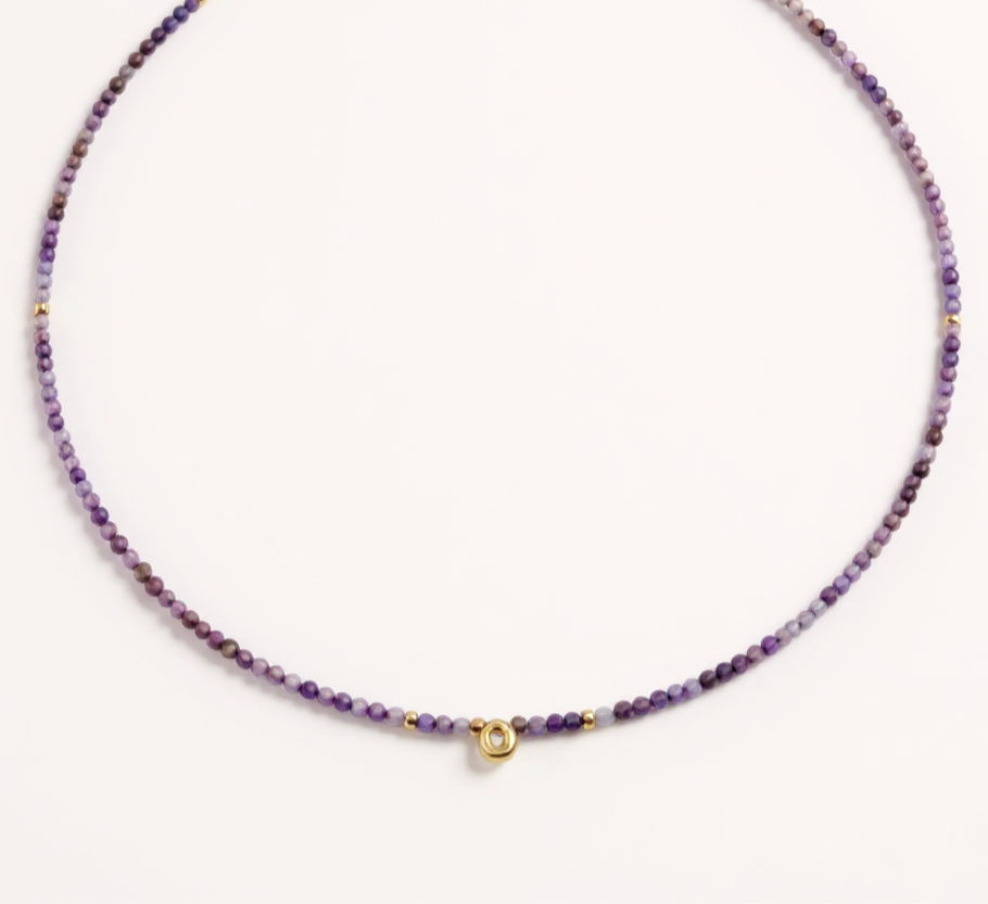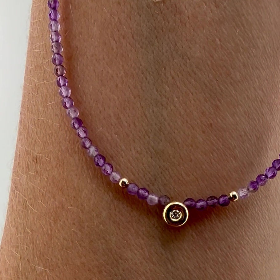 Rich amethyst beads accented with touches of 14K solid gold At its center rests a diamond pendant, also set in 14K solid gold, adding a timeless sparkle.