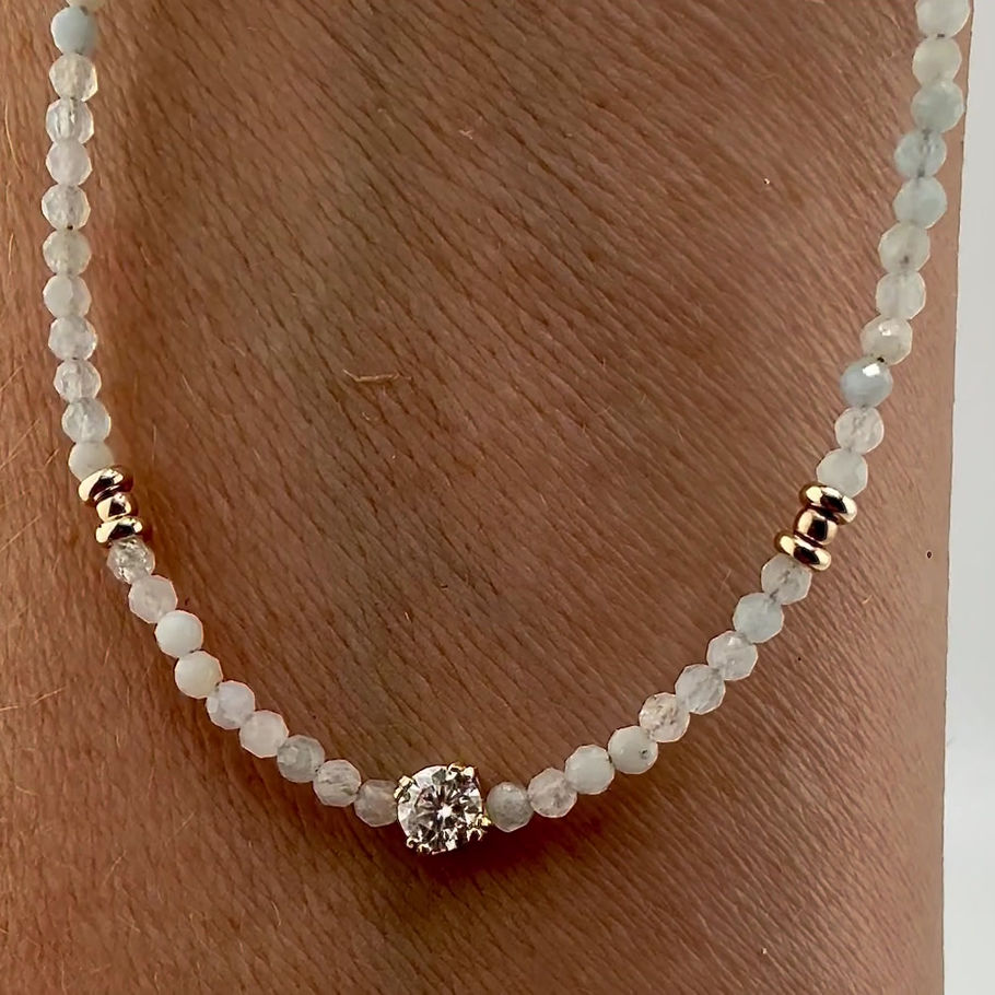 Classic elegance meets modern craftsmanship. This 2mm aquamarine beaded necklace is accented with solid gold findings. At its center, a brilliant 0.25 carat lab-created diamond shines from a 14K solid gold setting, ethically sourced and handmade in the USA.
