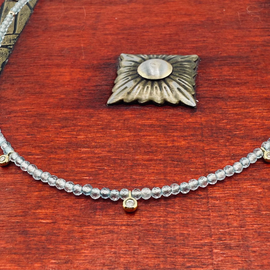 Dainty Blue Topaz Bead Necklace with Diamond Accents