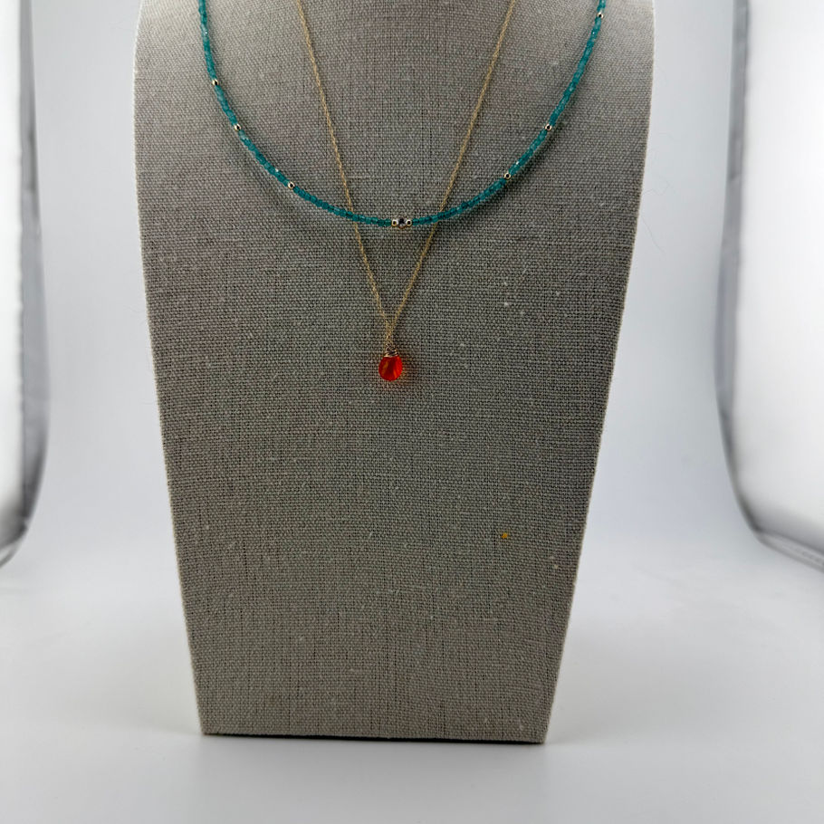 This pale blue apatite necklace features genuine 2mm stones beautifully accented with 14K solid gold beads and 0.1c lab created diamond center. Perfect for layering or wearing alone, this delicate 16-inch piece adds elegant sophistication to any outfit.