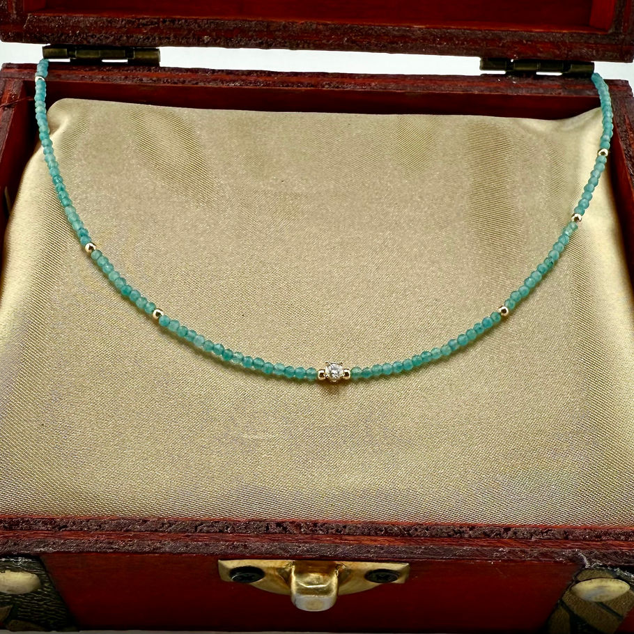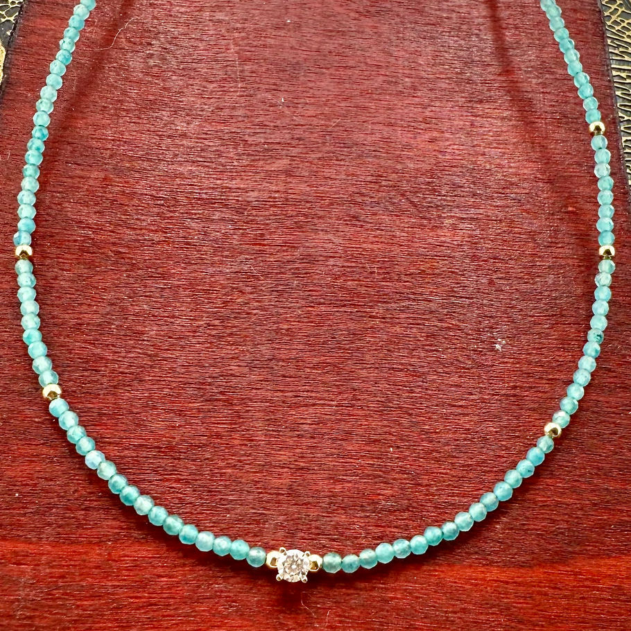 Delicate 14K Solid Gold & Apatite Beaded Necklace with 0.1c Lab Diamond