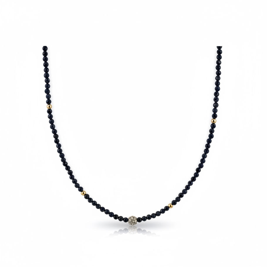 This pale blue sapphire necklace features genuine 2mm stones beautifully accented with 14K solid gold beads with 0.1c lab diamond center. Perfect for layering or wearing alone, this delicate 16-inch piece adds elegant sophistication to any outfit.