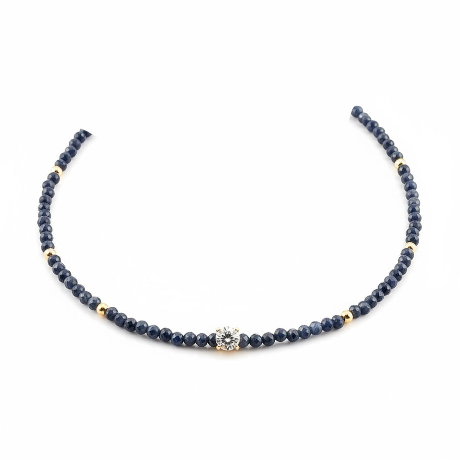 Delicate 14K Solid Gold & Blue Sapphire Beaded Necklace with 0.1c Lab Diamond