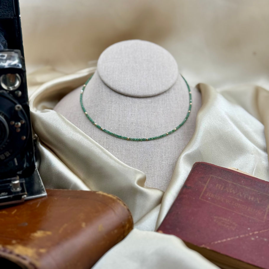 This dainty emerald necklace features genuine 2mm stones beautifully accented with 14K solid gold beads. Perfect for layering or wearing alone, this delicate 16-inch piece adds elegant sophistication to any outfit.