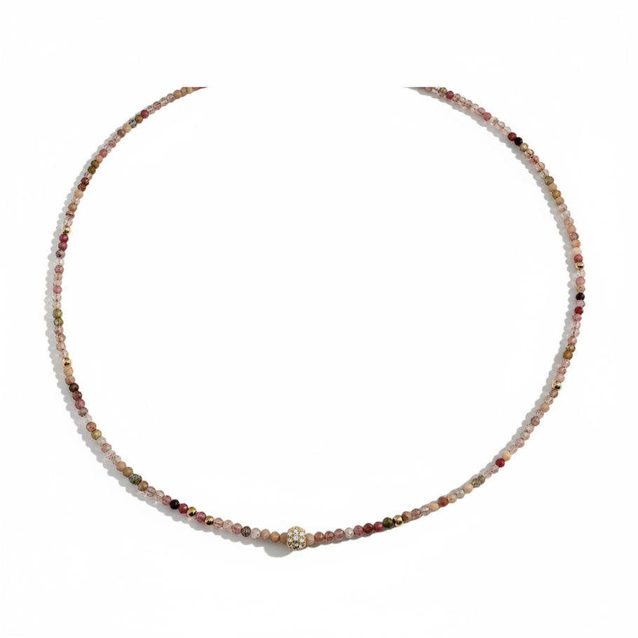 This tourmaline necklace features genuine 2mm stones beautifully accented with 14K solid gold beads and 0.1c lab diamond center. Perfect for layering or wearing alone, this delicate 16-inch piece adds elegant sophistication to any outfit.