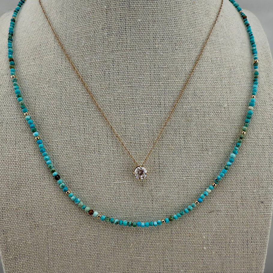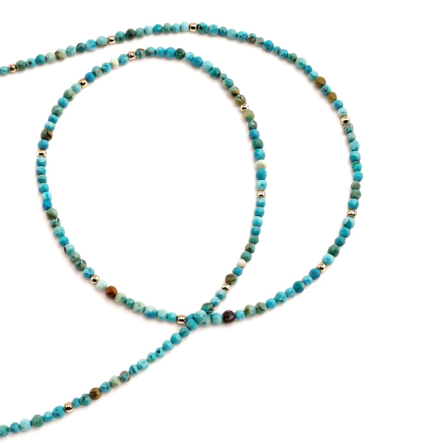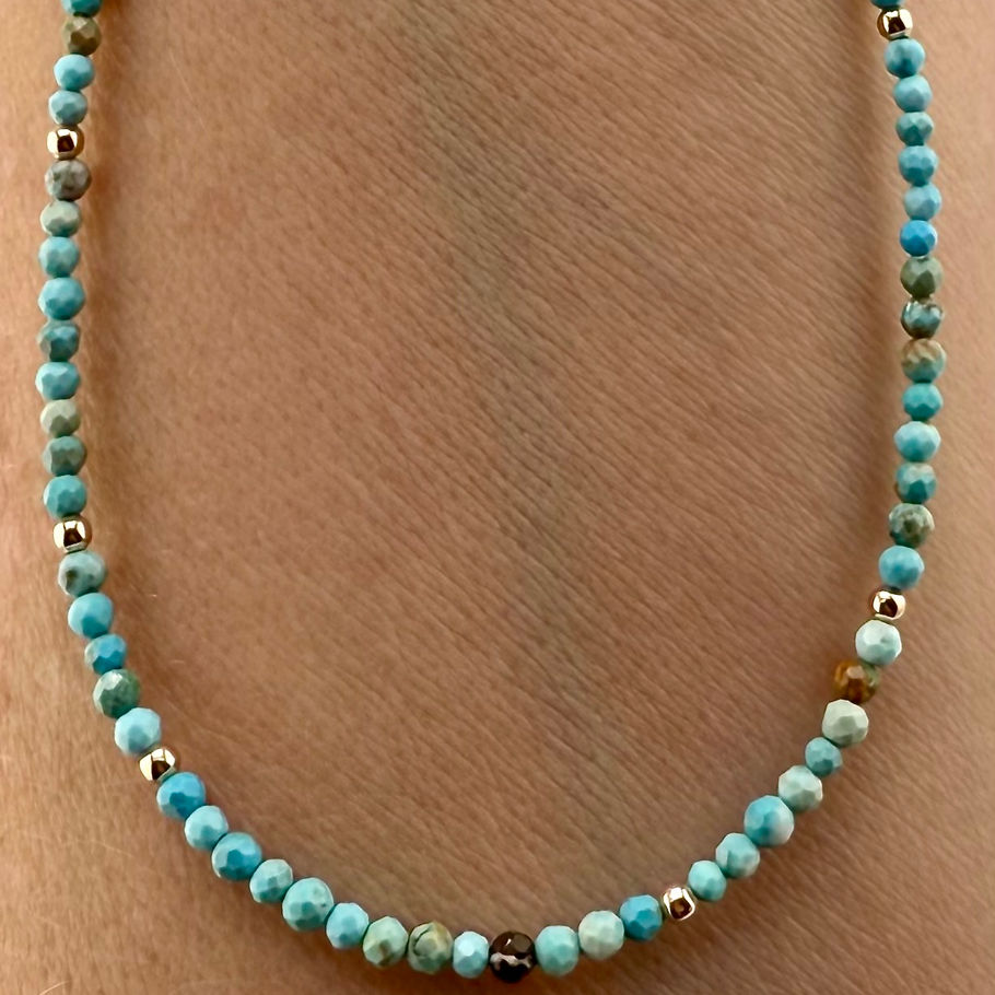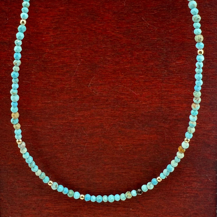 This turquoise necklace features genuine 2mm stones beautifully accented with 14K solid gold beads. Perfect for layering or wearing alone, this delicate 16-inch piece adds elegant sophistication to any outfit.