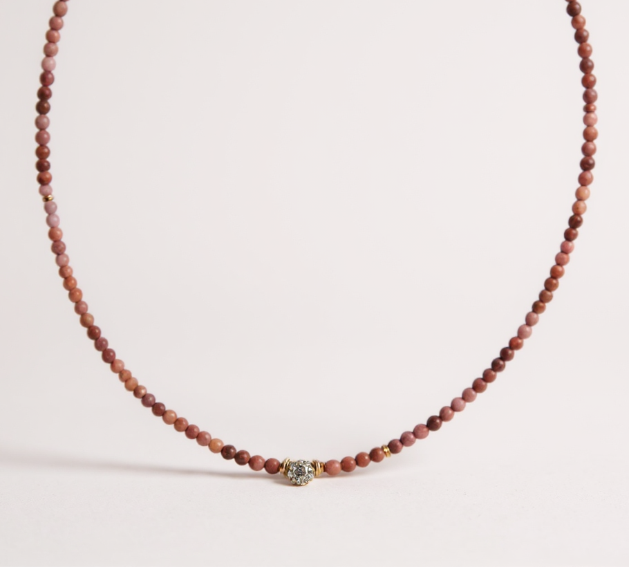 Classic elegance meets modern craftsmanship. This 2mm Pink Tourmaline beaded necklace is accented with solid gold findings. At its center, a brilliant 0.1 carat lab-created diamond shines from a 14K solid gold setting, ethically sourced and handmade in the USA.