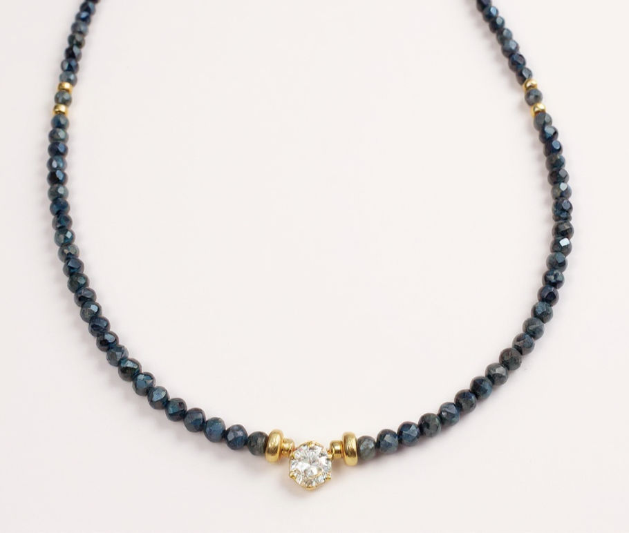 Classic elegance meets modern craftsmanship. This 2mm sapphire beaded necklace is accented with solid gold findings. At its center, a brilliant 0.1 carat lab-created diamond shines from a 14K solid gold setting, ethically sourced and handmade in the USA.