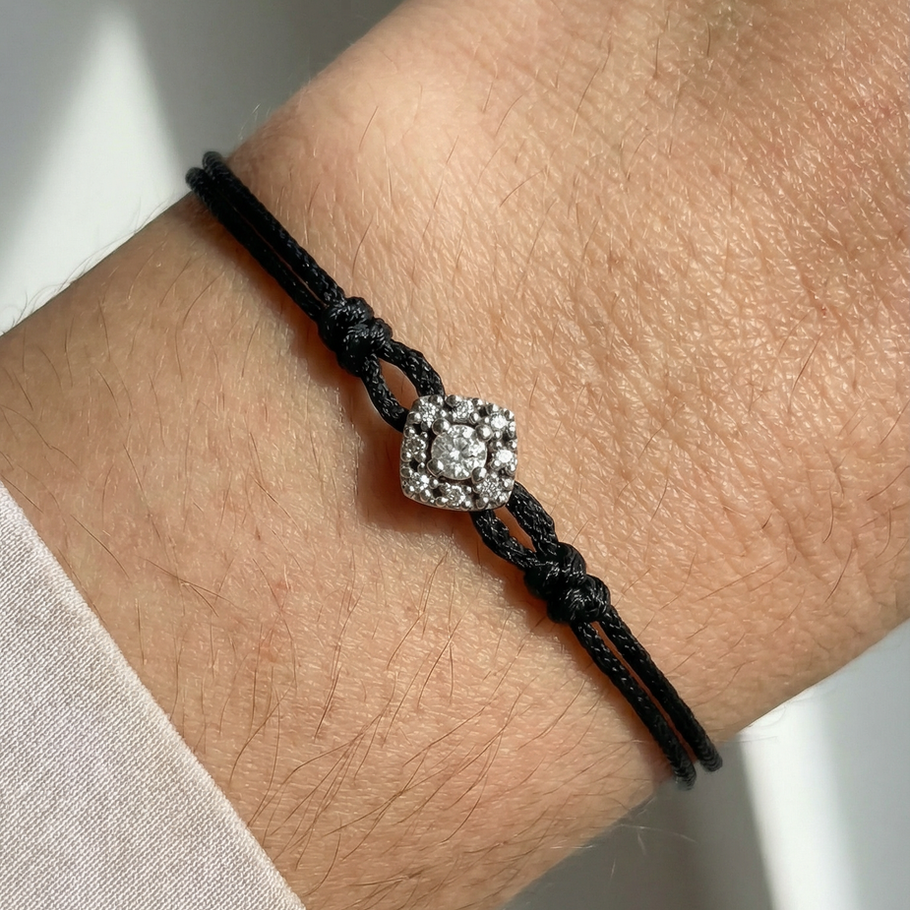 This bracelet features a 10k solid white gold charm with diamonds (0.125 total carats) on a customizable nylon cord.